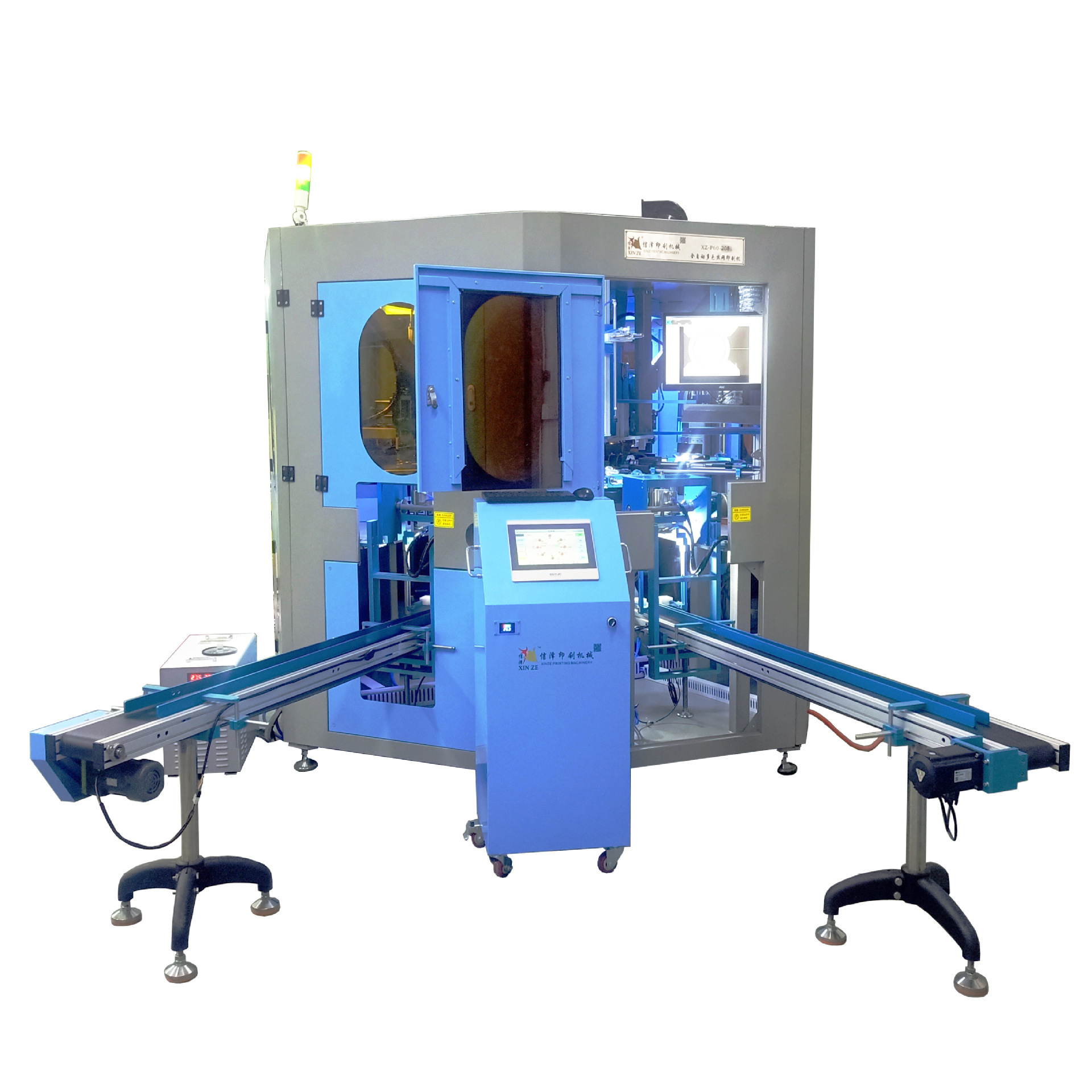 自(zì)動多(duō)功能(néng)伺服絲印這台機(jī)器(qì)一(yī)般是以印刷模組(一(yī)般是由旋轉軸、印刷軸、網版軸和升降軸四個(gè)軸組成)為(wèi)主,配合印前的燒火、除塵等表面處理和印後的 LED或UV烘烤等工(gōng)藝機(jī)構結合而成的絲印機(jī)型,根據産品要求,可選配CCD視頻定位系統,本機(jī)型其難度主要體現在對印刷模組的四軸聯動控制上(shàng),對數學模型,控制性能(néng)和伺服的動态響應有一(yī)定的要求。